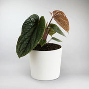 Anthurium luxurians x radicans is a rare hybrid prized for thick, heavily textured leaves with a glossy, almost reptilian finish. More compact than many velvet types, it fits smaller spaces while still delivering high drama. Provide bright, indirect light, steady warmth, and good humidity. Let the top compost dry slightly between waterings.