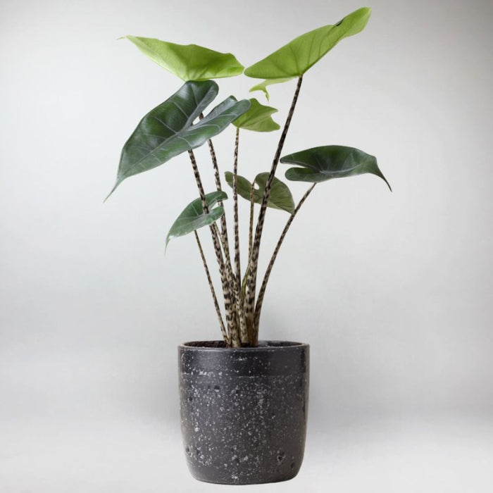 Alocasia Black Zebrin, which we also call Black Zebrina, dazzles with deep, almost black stems and large glossy leaves etched with bold veins. It’s an instant focal point for living rooms and studios. It brings a chic presence indoors while remaining surprisingly adaptable to indoor life.