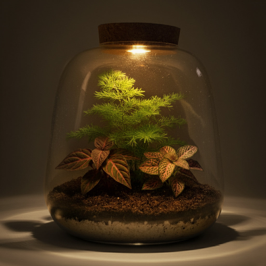 Terrarium care is pretty easy. Keep the substrate lightly moist but not waterlogged (test by feeling the top 1 to 2cm). Mist every 2 to 5 days to maintain humidity, more often in dry indoor heat. Use a free-draining humus-rich mix with a layer of pebbles or activated charcoal for drainage and odor control. Trim asparagus shoots and pinch Hypoestes tips to encourage bushiness; remove any yellowing leaves promptly. Feed sparingly: a diluted liquid fertilizer (of quarter strength) once a month during active growth. Pet safety: Hypoestes and Hemigraphis are generally considered low-toxicity, but keep terrariums out of reach of pets and children.