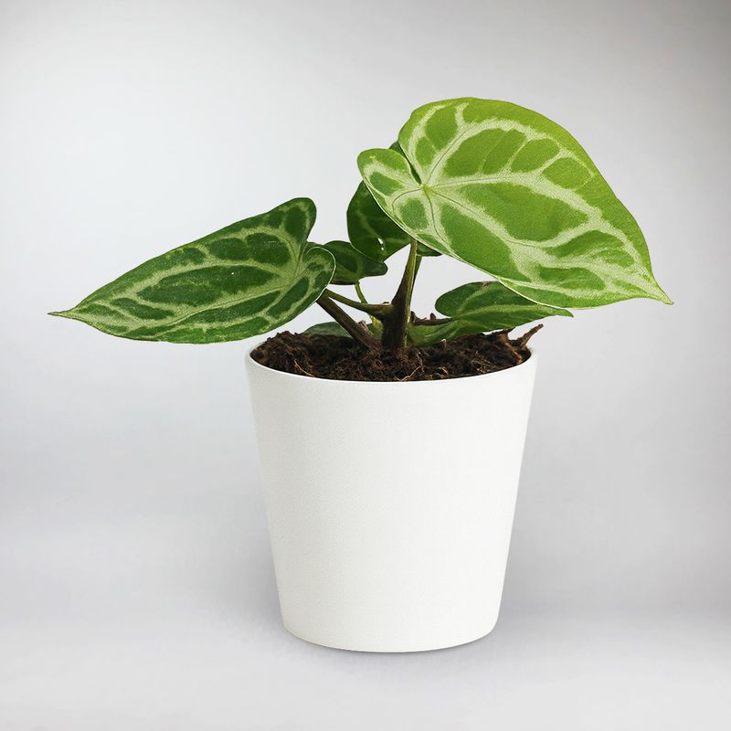 Anthurium ‘Silver Blush’ is a velvet‑leaf hybrid with soft silvery washes over deep green, heart‑shaped leaves. Even at a smaller size it delivers serious impact thanks to its shimmering surface and crisp veining. Keep it warm with good humidity and bright, indirect light. Water when the top layer dries slightly and use a bark‑rich, airy mix.