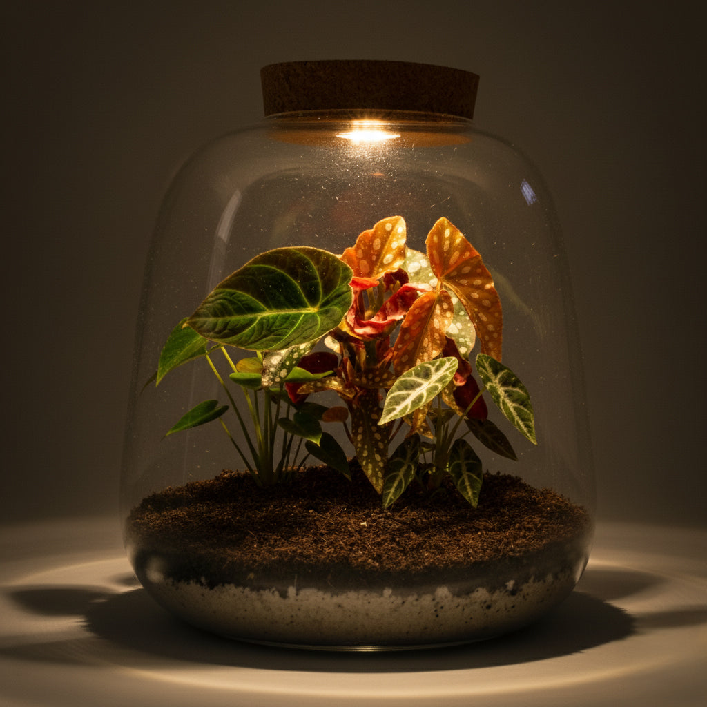 All three species remain compact when grown in confined terrarium environments. Expect mature terrarium heights of roughly 10 to 30cm, depending on container size and pruning. Alocasia produces short upright stems and stays compact when root-bound. Begonia Maculata forms a low clump with occasional vertical shoots. Anthurium will send occasional taller petiole(s) but remains manageable. Growth rate is moderate under optimal humidity and filtered light. Do plan for periodic trimming (every 4 to 12 weeks) to maintain scale.